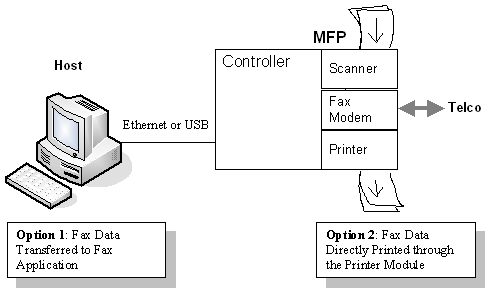 The host/PC is an interface between the user and the MFP. The host can send and receive data to and from the MFP, using it very much like a traditional computer peripheral providing conventional printing and scanning functions. The host can also send data to the MFP to have it transmitted as a fax, or receive a fax call from the MFP and save the incoming fax data as a file on the computer. When or if the host is offline, the MFP can store received faxes in its internal memory where the host can retrieve them at a later time.