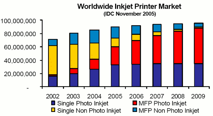 Weakening sales for single-function printers are attributed to the growing popularity of MFPs. The use of MFPs has spread faster in small and medium enterprises (SMEs) compared to larger corporations, according to Mason Olds, vice-president of Canon Canada’s Imaging Systems Group. The reason is that MFPs enable smaller business owners to save about 10 percent off the cost of four separate devices. They also use up less space in small offices. According to figures from Evans Research Corp, MFP sales made up about 18% of the printer market in 2002 which grew to 37% by 2004.Figure 3show the IDC’s projections for the inkjet MFP market.