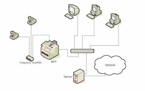 In Figure 1, we see a typical setup of a small IT infrastructure. The MFP, a single unit occupying only the space of a large laser printer, takes the place of a printer, scanner, photocopier, and fax machine. The result – maximum workflow efficiency and cost savings to a business.