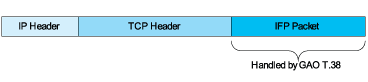 In a TCP session, the GAO T.38 solution will exchange IFP packets with the application that is the TCP payload as shown in Figure 2. It is the responsibility of the TCP stack to create or remove the TCP and IP headers, and to ensure proper delivery and error correction of the TCP packet.