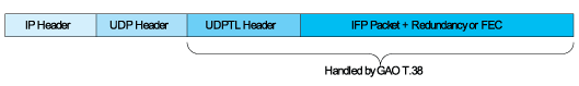 In a UDP session, the GAO T.38 solution will exchange packets with the application that contains UDPTL headers, the IFP packet and either UDPTL redundancy or UDPTL forward error correction. These packets are the UDP payload as shown in Figure 3. It is the responsibility of the UDP stack to create or remove the UDP and IP headers, and to handle any other UDP based protocols such as RTP. The GAO T.38 solution will handle packet re-ordering and error detection or correction in the UDPTL module as per the T.38 standard.