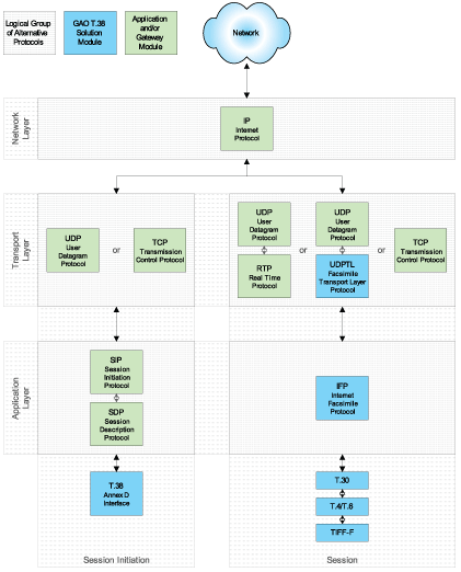 As shown in Figure 4, the interface with the IP network is provided by the local gateway and is mostly independent of the T.38 solution. The standard transport layer protocol that will be used by the gateway is either UDP + RTP, UDP + UDPTL or TCP.